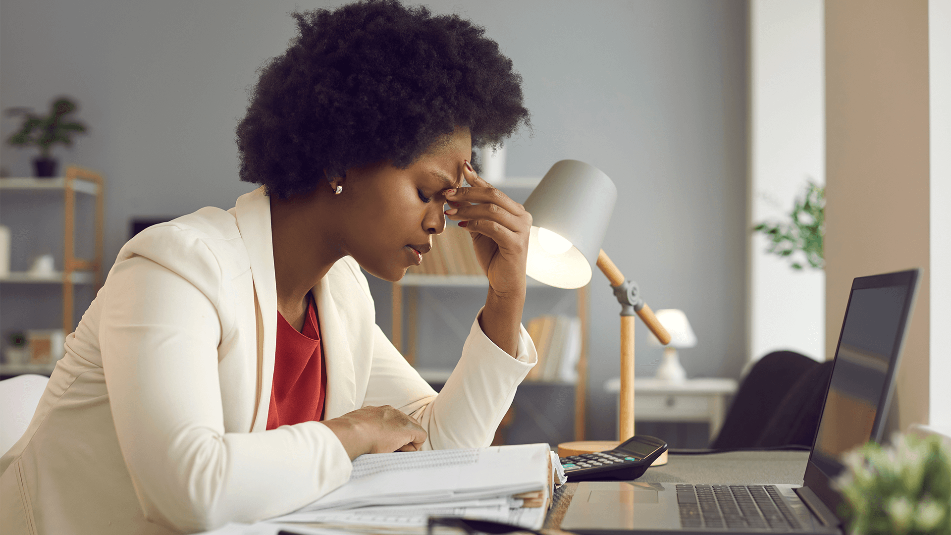 woman keeping eyes closed and massaging nose after working at laptop for long time