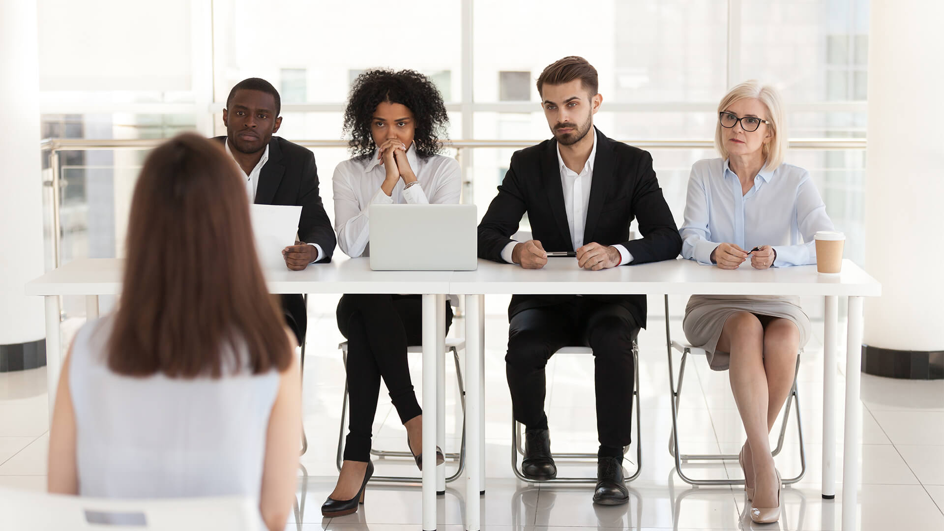 Woman being interviewed by two other women and two men