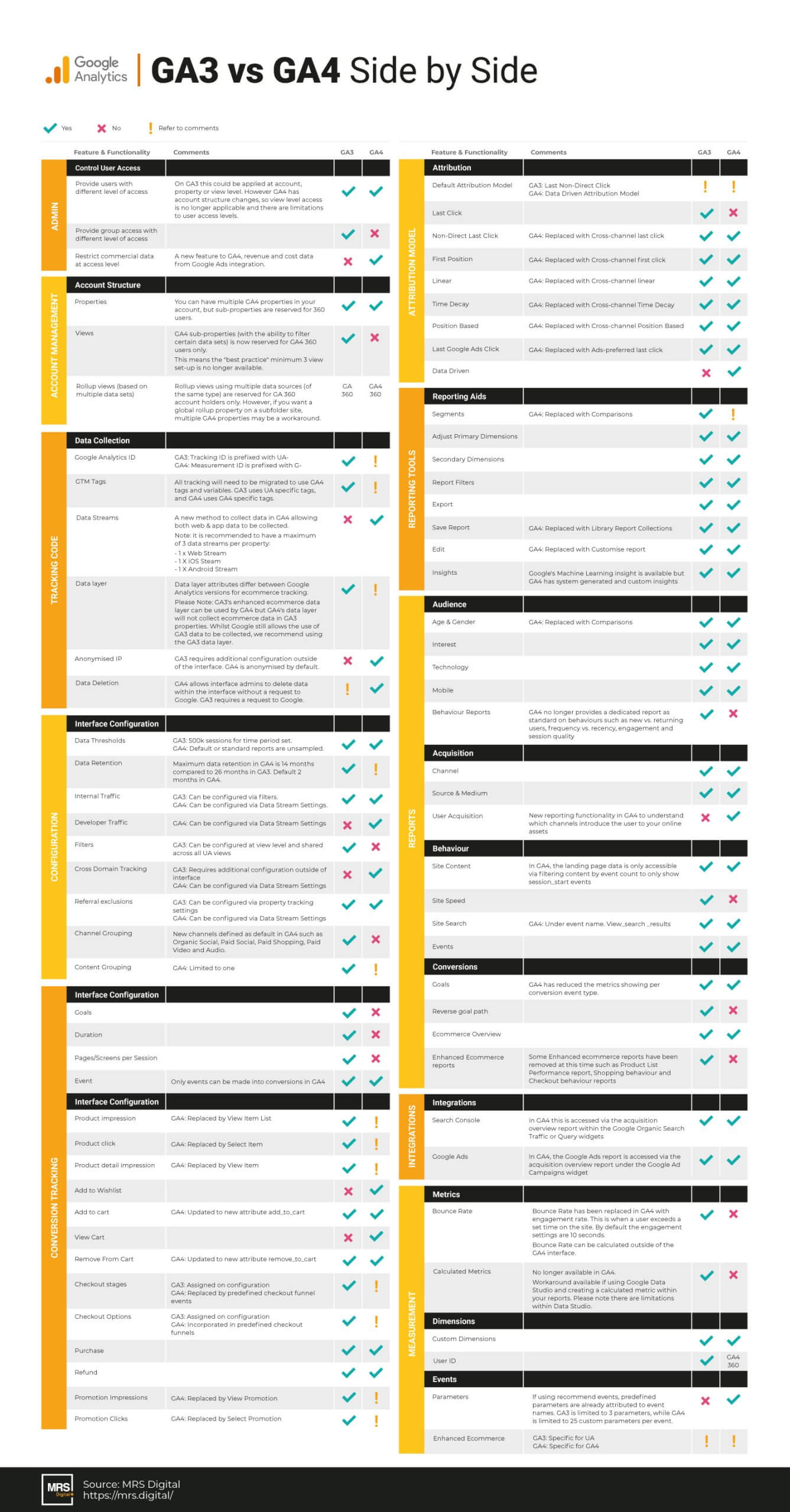 The help sheet has been designed with MRS Digital’s years of expertise and knowledge and aims to make what is on the surface a difficult interface, an understandable one. The help sheet compares 16 sections and 79 features so that digital marketers can gain more insight into GA4 and instantly see how the function they’re looking for has changed.